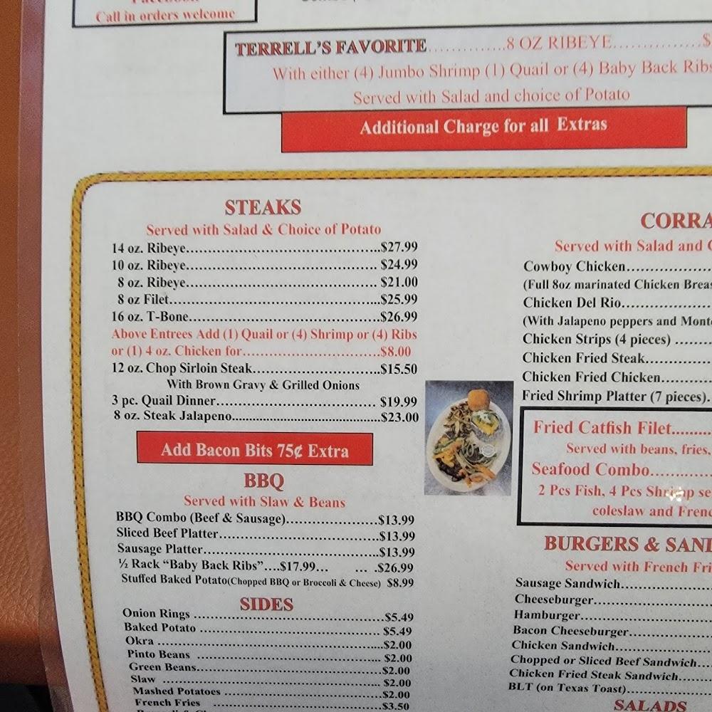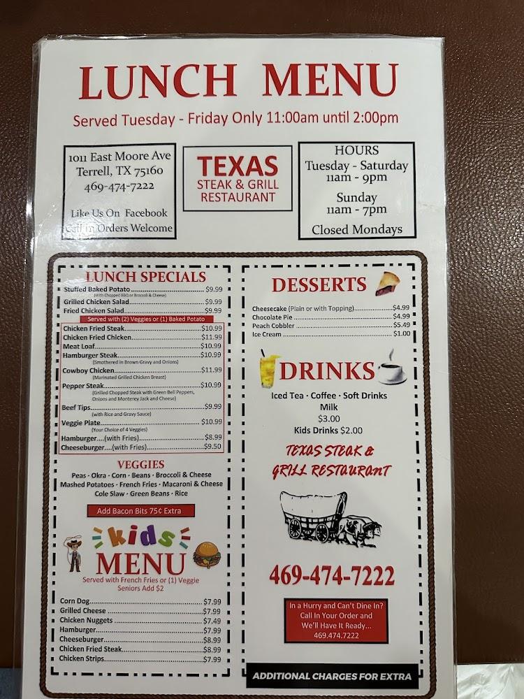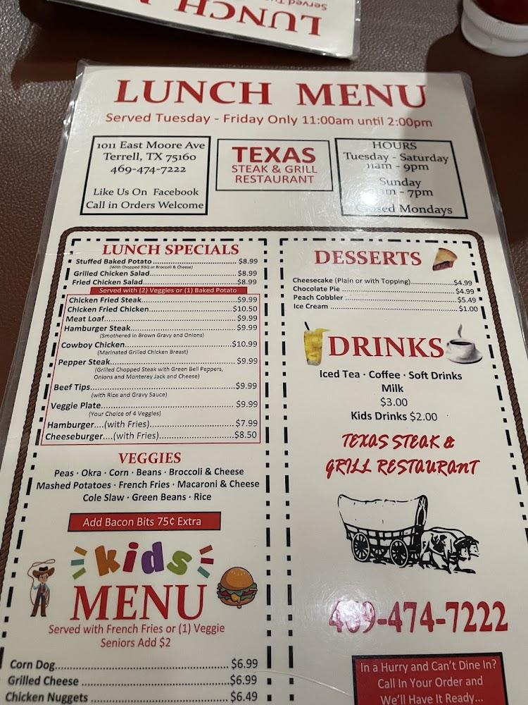 Welcome to Texas Steak & Grill, your ultimate destination for authentic American barbecue in Terrell, TX. Located at 1011 E Moore Ave, we offer a delightful dining experience with a relaxed ambiance perfect for groups or solo diners. Savor our mouth-watering steaks, loaded baked potatoes, and scrumptious desserts at affordable prices ranging from $10 to $20. Enjoy convenient services like carry-out, dine-in, and delivery. Our family-friendly environment features accessible seating and a kid's menu, ensuring everyone feels at home. Whether you're here for lunch or dinner, come relish the local specialties that make us a beloved spot for food lovers!